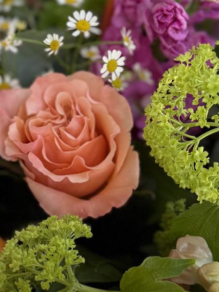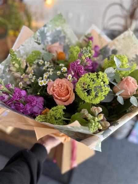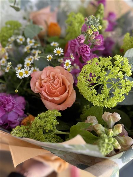 Featuring premium seasonal blooms including peach roses, vibrant stocks, delicate chamomile daisies, fresh snapdragons, tulips, textural green viburnum and soft eucalyptus foliage, this bouquet is full, layered and beautifully balanced. Every stem is carefully selected for freshness, scent and movement, creating a design that feels effortlessly romantic and naturally elegant.