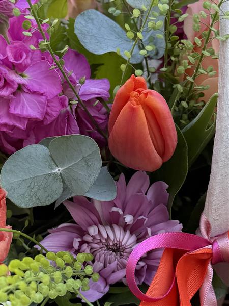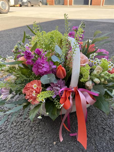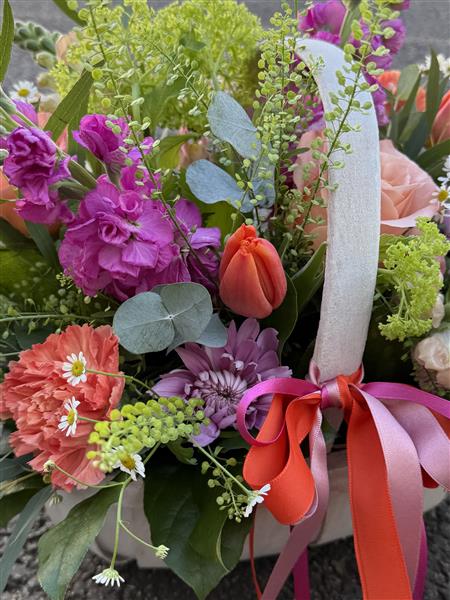 The Emmy- A joyful celebration of colour, texture and seasonal beauty, this hand made floral basket is designed with premium blooms including vibrant tulips, scented stocks, snapdragons, chrysanthemums, delicate chamomile daisies and fresh eucalyptus foliage. Finished with luxury ribbon detailing and presented in a natural wooden white washed trug basket. It’s ready to gift the moment it arrives.