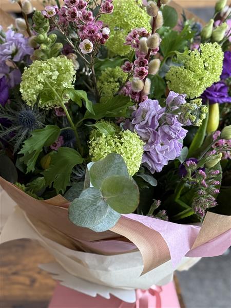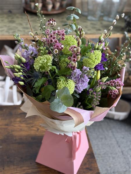 A perfect bouquet for those who love their garden! Featuring delicate textures and scents with seasonal florals including where possible, Stocks, Pussy Willow, Waxflowers and lots more.